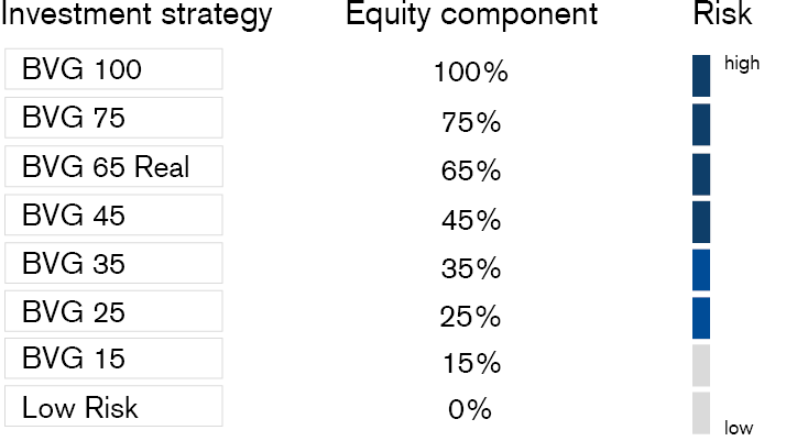 - Individual choice of eight investment strategies with an attractive cost structure: Different investment vehicles are offered with an equity component ranging from 0% to 100% in line with the risk profile and the chosen strategy.