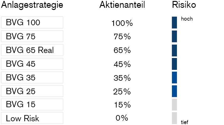 - Individuelle Wahl zwischen acht Anlagestrategien mit einer attraktiven Kostenstruktur: Entsprechend dem Risikoprofil bzw. der gewählten Strategie werden unterschiedliche Anlagegefässe mit Aktienquoten von 0% bis 100% angeboten.